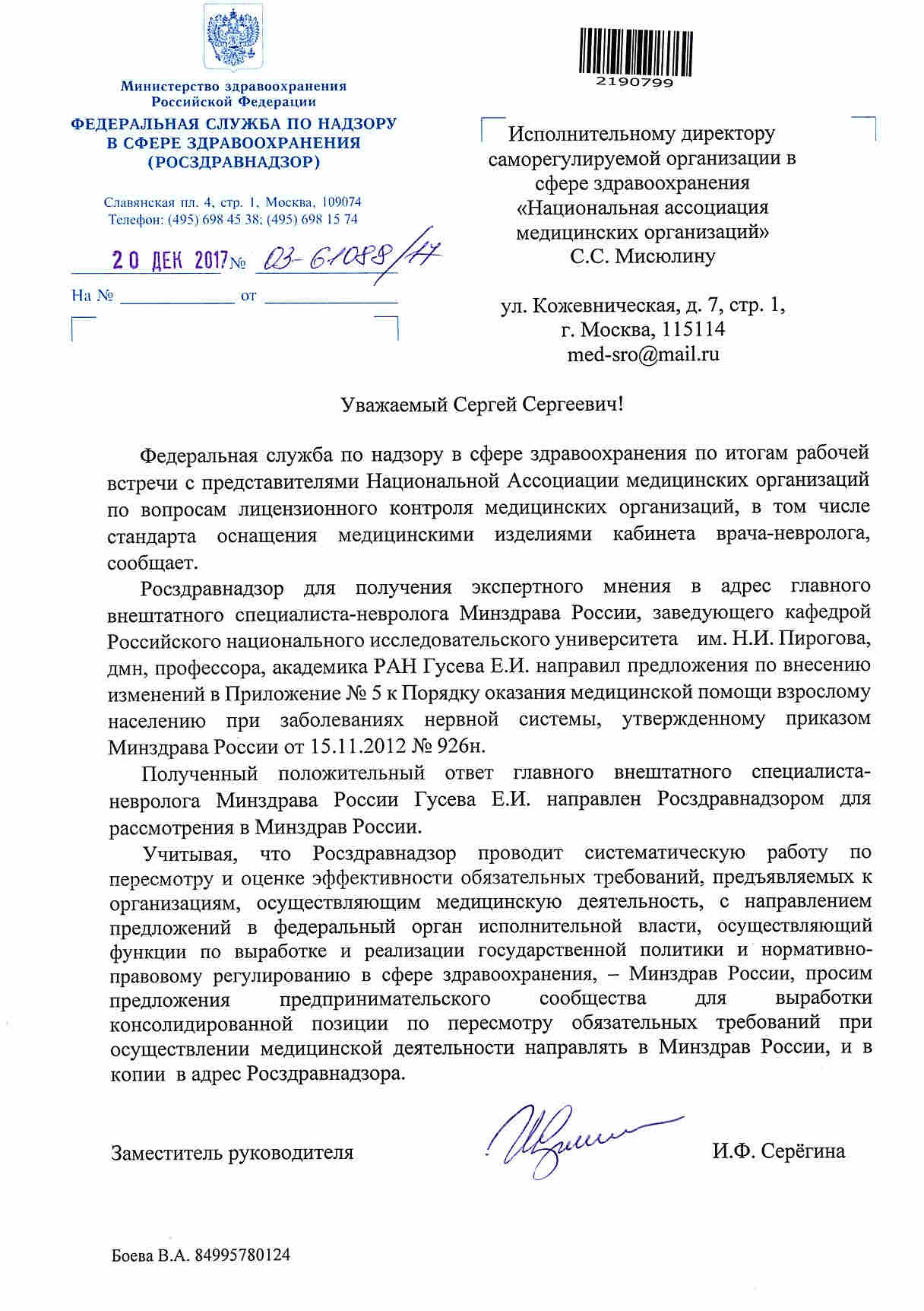 От лица Национальной Ассоциации выражаю Вам благодарность за плодотворное сотрудничество в сфере совершенствования нормативно-правовой базы. По итогам рабочей встречи Вашего заместителя Серёгиной Ирины Фёдоровны с представителями Ассоциации по вопросам лицензионного контроля медицинской деятельности, в том числе стандарта оснащения кабинета врача-невролога Росдравнадзор, заручившись поддержкой главного внештатного специалиста-невролога Минздрава России, д.м.н., профессора, академика РАН Гусева Е.И., направил в Минздрав предложения по внесению изменений в Приложение №5 к Порядку оказания медицинской помощи взрослому населению при заболеваниях нервной системы, утвержденному приказом Минздрава России от 15.11.2012 №926н
